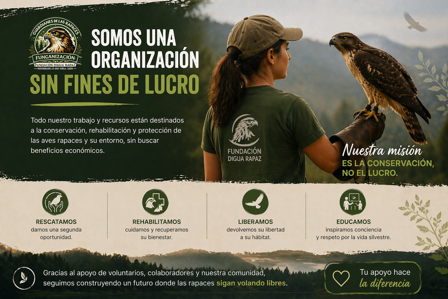 Somos una organización sin fines de lucro, lo que significa que todo nuestro trabajo y recursos están destinados a la conservación, rehabilitación y protección de las aves rapaces, sin buscar beneficios económicos. Nuestro propósito es generar un impacto positivo en la naturaleza y la comunidad.
